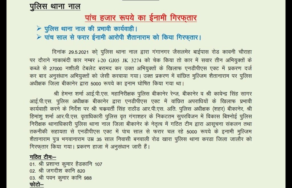 बीकानेर के नाल थाना पुलिस ने प्रभावी कार्यवाही करते हुए 5 साल से फरार इनामी शैतनाराम को गिरफ्तार किया है पुलिस फिलहाल अनुसंधान कर रही है