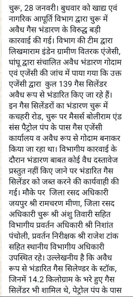 City/Local गैस सिलेंडर के अवैध भंडारण पर बड़ी कार्रवाई 139 सिलेंडर जप्त किये Pradeep Kumar Modi January 29, 2026 0 Post navigation Previous: दुखद घटना महाराष्ट्र में विमान हादसे में उपमुख्यमंत्री सहित 6 लोगों की मृत्यु।Next: बीकानेर POCSO एक्ट में आरोपी गिरफ्तार, More Stories City/Local *उचित मूल्य की रिक्त व नवसृृजित दुकानों के साक्षात्कार 24 से 26 फरवरी को* Pradeep Kumar Modi February 11, 2026 0 City/Local बीकानेर सिलेंडर ब्लास्ट पांच लोग चपेट में आए अस्पताल में इलाज जारी। Pradeep Kumar Modi February 11, 2026 0 City/Local Crime पुलिस ने दो शातीर बदमाशों को पकड़ा नशीला पदार्थ व हथियार सहित Pradeep Kumar Modi February 10, 2026 0 Leave a Reply Cancel replyYour email address will not be published. Required fields are marked *Comment * Name * Email * Website Save my name, email, and website in this browser for the next time I comment.