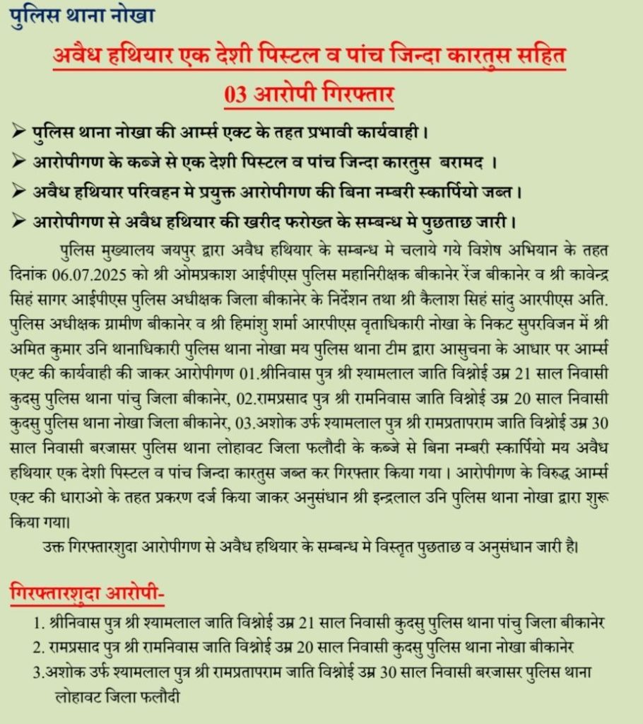बीकानेर के नोखा थाना द्वारा आर्म एक्ट में प्रभावी कार्रवाई अवैध हथियार वह पांच जिंदा कारतूस सहित तीन आरोपियों को पकड़ा पुलिस ने आरोपियों से हथियार बरामद कर लिया। और बिना नंबर की स्कॉर्पियो गाड़ी भी पुलिस ने जप्त की है, पकड़े गए आरोपियों के पुलिस खरीद फरोख्त के बारे में जानकारी जुटा रही है मामले में अनुसंधान जारी  है