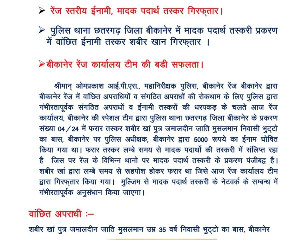 Bikaner News ATN/नशे के खिलाफ बीकानेर के छतरगढ़ थाना पुलिस की बड़ी कार्रवाई,*तस्करी के मामले में वांछित ईनामी तस्कर शबीर खान को गिरफ्तार किया है*। *यह कार्रवाई बीकानेर रेंज कार्यालय टीम द्वारा की गई है* *रेंज कार्यालय की स्पेशल टीम द्वारा पुलिस थाना छत्तरगढ़ के प्रकरण में फरार तस्कर शबीर खां पुत्र जमालदीन निवासी भुट्टों का बास बीकानेर को गिरफ्तार किया है*, *जिस पर पुलिस अधीक्षक द्वारा पांच हजार रुपए का ईनाम घोषित कर रखा था*।