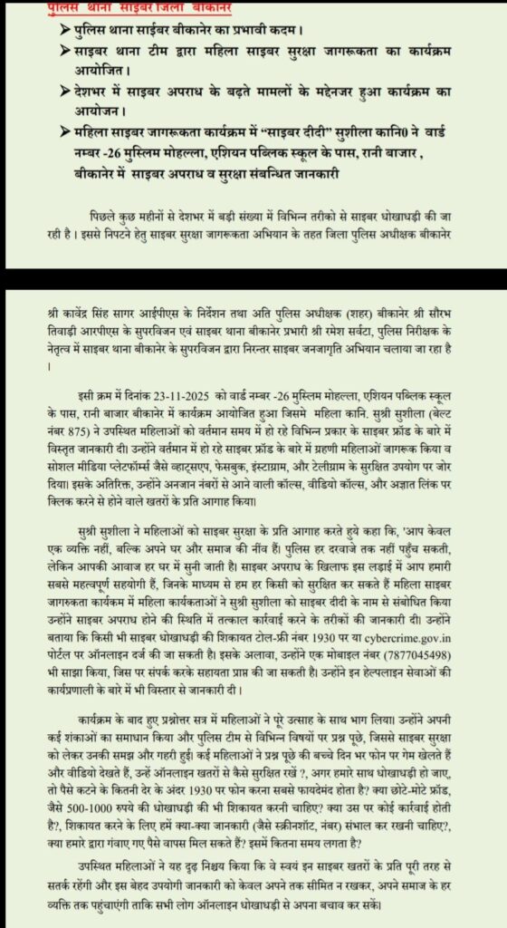 बीकानेर साइबर थाना पुलिस का प्रभावित कदम साइबर थाना टीम द्वारा महिला साइबर सुरक्षा जागरूकता कार्यक्रम का आयोजन देशभर में साइबर अपराध के बढ़ते मामलों के मध्य नजर यह कार्यक्रम किया गया महिला साइबर जागरूकता कार्यक्रम में साइबर दीदी सुशीला कांस्टेबल ने वार्ड नंबर 26 मुस्लिम मोहल्ला एशियन पब्लिक स्कूल के पास रानी बाजार बीकानेर में साइबर अपराध व सुरक्षा संबंधित जानकारी दी।