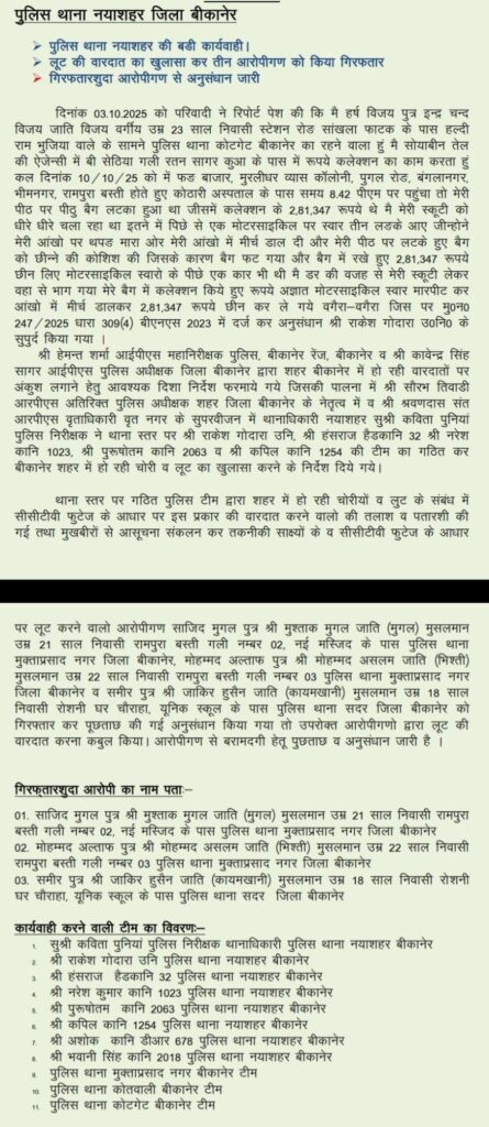 बीकानेर पुलिस ने लूट के तीन आरोपियों को पकड़ा।