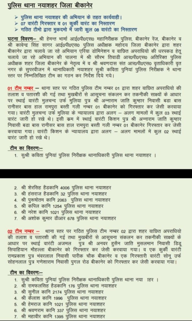 बीकानेर नया शहर थाना द्वारा विशेष अभियान के तहत की गई कार्रवाई में सात वारंटी को गिरफ्तार किया वह एक कुर्की वारंट का निस्तारण किया पुलिस विभाग द्वारा गठित टीमों द्वारा मुकदमों में जारी कुल 6 वारंटो का निस्तारण किया यह कार्रवाई महानिरीक्षक पुलिस बीकानेर रेंज बीकानेर जिला पुलिस अधीक्षक कावेंद्र सिंह सागर के निर्देशन में की गई।