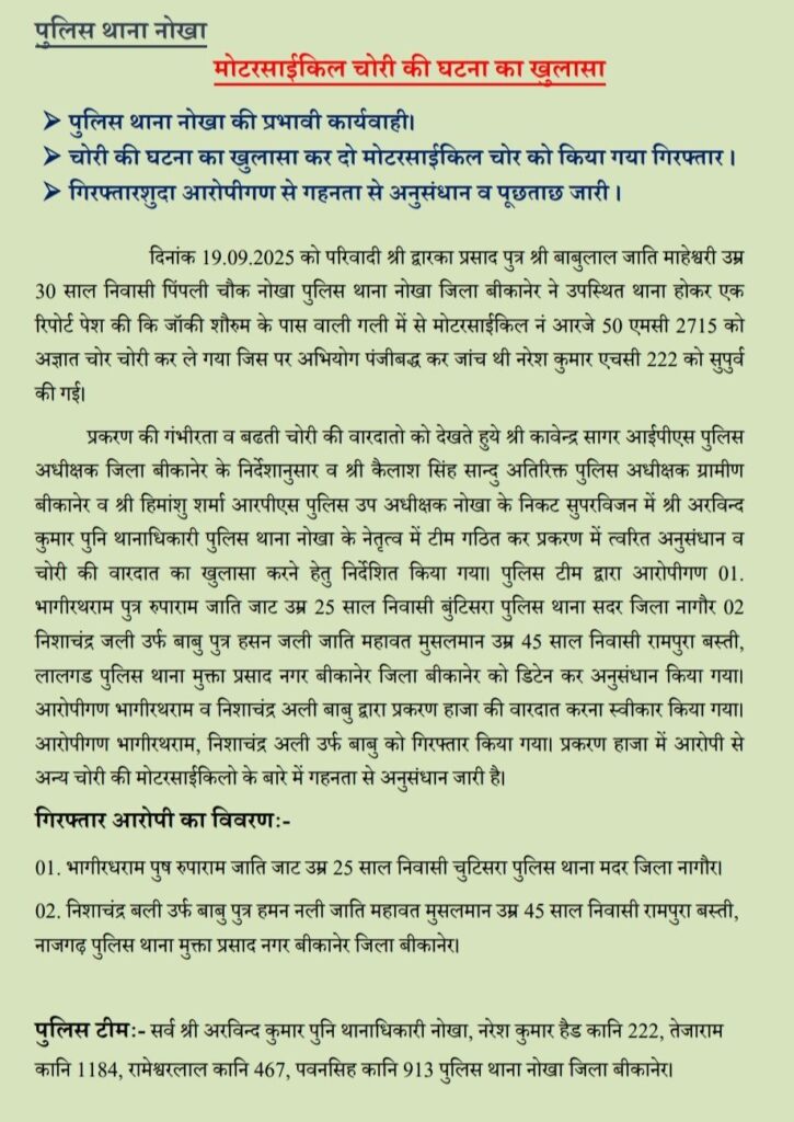 बीकानेर के नोखा थाना पुलिस ने प्रभावी कार्रवाई करते हुए चोरी की घटना का खुलासा करके दो मोटरसाइकिल चोरों को गिरफ्तार किया है गिरफ्तार किए गए आरोपियों से अन्य चोरी के बारे में पुलिस फिलहाल अनुसंधान कर रही है पूछताछ आरोपियों से जारी है