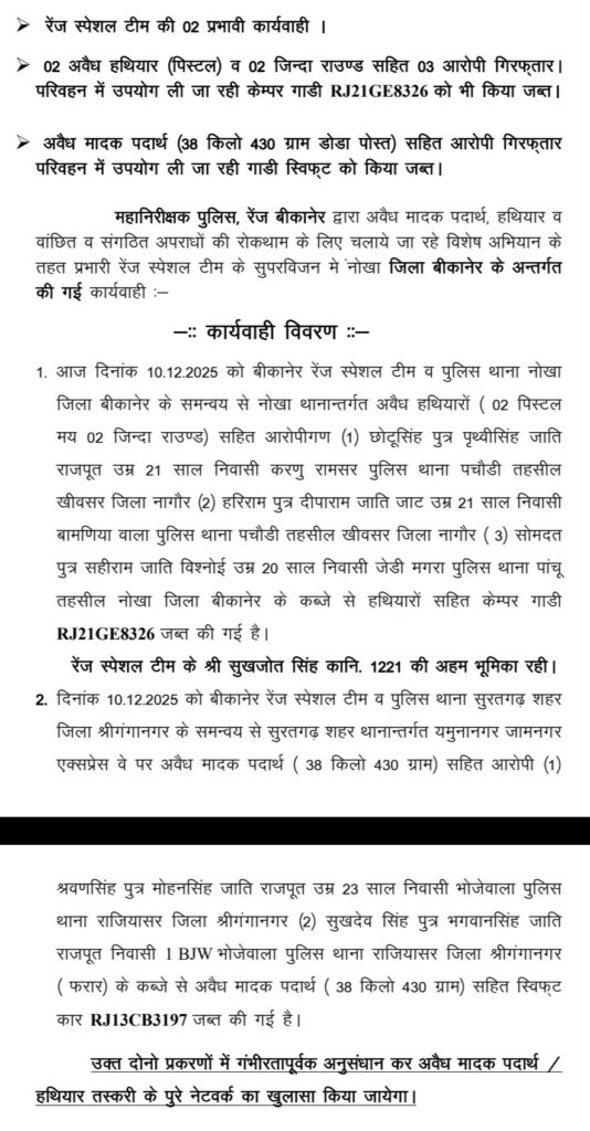बीकानेर रेंज पुलिस की दो प्रभावी कार्रवाई।