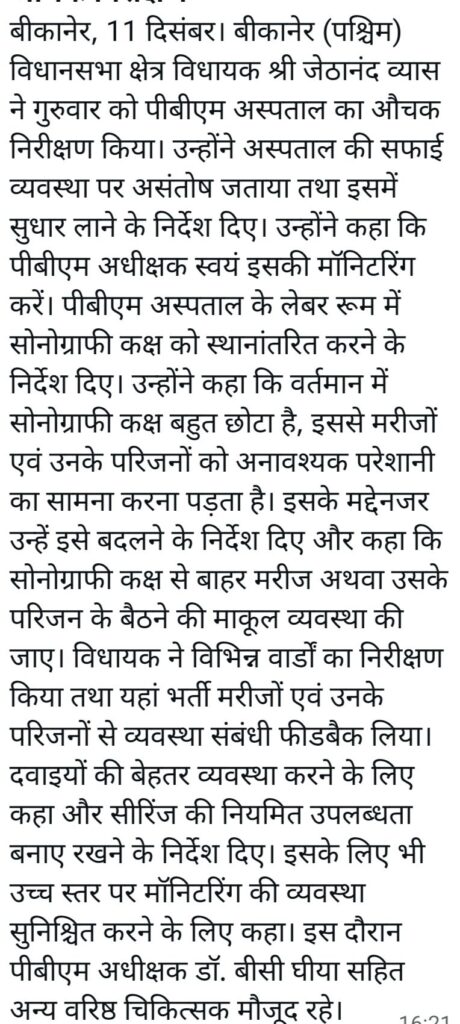 Politics बीकानेर विधायक ने अचानक किया पीबीएम अस्पताल का निरीक्षण और फिर,, Pradeep Kumar Modi December 11, 2025 0 बीकानेर विधायक ने अचानक किया पीबीएम का निरीक्षण। Post navigation Previous: बीकानेर अवैध देसी कट्टा सहित आरोपी को गिरफ्तार किया।Next: बीकानेर की सबसे बड़ी समस्या कोटगेट फाटक को लेकर खबर। More Stories Politics बीकानेर की सबसे बड़ी समस्या कोटगेट फाटक को लेकर खबर। Pradeep Kumar Modi December 11, 2025 0 Politics बीकानेर विधायक ने निरीक्षण किया। Pradeep Kumar Modi December 1, 2025 0 Politics राजस्थान कांग्रेस में फेरबदल नए जिला अध्यक्ष की नियुक्ति बीकानेर में इनको जिम्मेदारी सौंपी । Pradeep Kumar Modi November 22, 2025 0 Leave a Reply Cancel replyYour email address will not be published. Required fields are marked *Comment * Name * Email * Website Save my name, email, and website in this browser for the next time I comment.