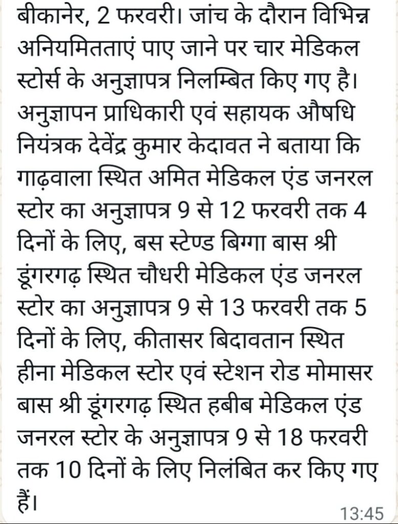 बीकानेर जांच के दौरान विभिन्न प्रकार की अनियमितताएं पाए जाने के कारण चार मेडिकल स्टोर के अनुज्ञा पत्र निलंबित किये