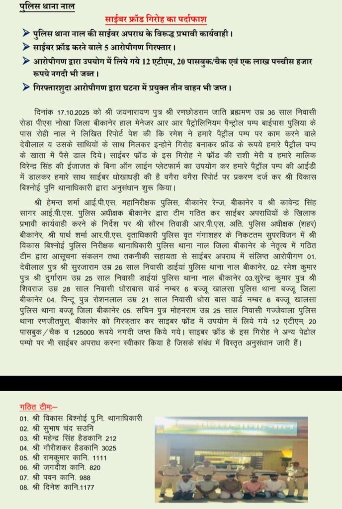 बीकानेर के नाल थाना पुलिस की साइबर अपराध के विरुद्ध बड़ी कार्रवाई साइबर फ्रॉड करने वाले पांच आरोपियों को गिरफ्तार किया आरोपियों द्वारा उपयोग में लिए गए 12 एटीएम 20 पासबुक चेक एवं 125000 नगदी पुलिस ने जप्त किया गिरफ्तार किए गए आरोपियों द्वारा घटना में प्रयुक्त तीन वहां भी पुलिस ने जप्त किए हैं।