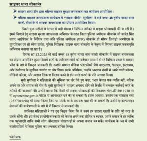 बीकानेर के साइबर थाना टीम द्वारा महिला साइबर सुरक्षा जागरूकता कार्यक्रम आयोजित किया गया साइबर सुरक्षा जागरूकता कार्यक्रम में साइबर दीदी सुशील ने वार्ड नंबर 48 बांद्रा बास बस्ती बीकानेर में साइबर जागरूकता का प्रोग्राम आयोजित किया।
