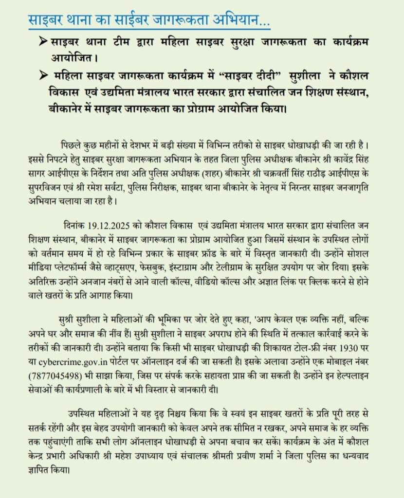 बीकानेर के साइबर थाना टीम द्वारा महिला साइबर सुरक्षा जागरूकता कार्यक्रम आयोजित किया गया महिला जागरूकता कार्यक्रम में साइबर दीदी सुशील ने कौशल विकास एवं उद्यमिता मंत्रालय भारत सरकार द्वारा संचालित जन शिक्षण संस्थान बीकानेर में साइबर जागरुकता प्रोग्राम आयोजित किया कार्यक्रम में साइबर सुरक्षा संबंधी जानकारी दी गई।