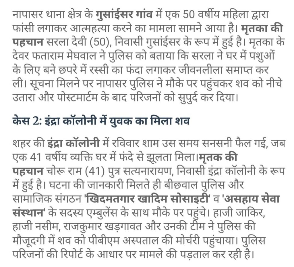 बीकानेर शहर के ग्रामीण क्षेत्र और शहरी क्षेत्र से दो अलग-अलग आत्महत्या की घटनाएं सामने आई है पहली घटना नापासर थाना क्षेत्र के गुसाईसर गांव से है वहीं दूसरी शहरी क्षेत्र के इंदिरा कॉलोनी से है,