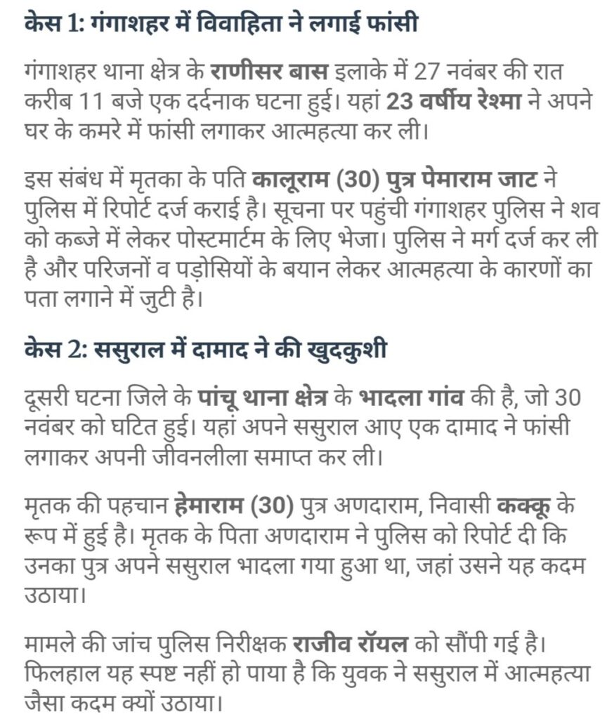 बीकानेर युवक ने ससुराल जाकर आत्महत्या की वही 33 वर्षीय विवाहिता ने भी फांसी का फंदा लगाकर आत्महत्या की।