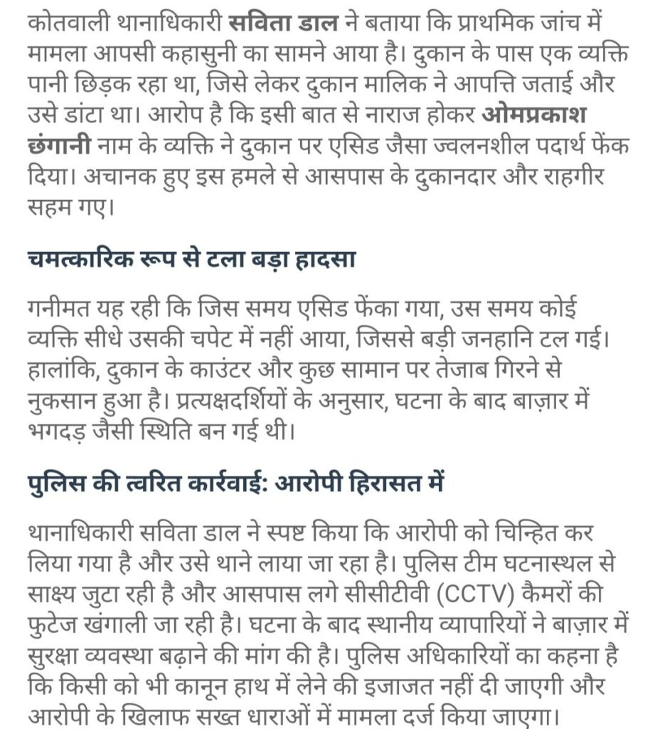 एसिड फेंकने की घटना बीकानेर के सबसे व्यस्ततम क्षेत्र बड़ा बाजार से है जहां पर एक दुकान में एसिड फेंकने की घटना घटित हुई और घटना के बाद क्षेत्र में अफरा तफरी मच गई जानकारी के अनुसार यह घटना बड़ा बाजार क्षेत्र स्थित ज्योति ट्रेडिंग कंपनी की है जहां पर व्यक्ति ने दुकान में अचानक एसिड फेंक दिया इसके बाद बाजार में हड़कंप मच गया, मौके पर मौजूद लोगों के अनुसार एसिड फेंकने की वजह से दुकान में काउंटर और वहां रखे सामान एसिड से जल गया, गनीमत यह रही कि एसिड की चपेट में कोई दुकानदार सीधे तौर पर नहीं आया अन्यथा बड़ा हादसा हो सकता था, घटना की सूचना मिलने पर कोतवाली थाना से पुलिस भी तुरंत मौके पर पहुंच गई।