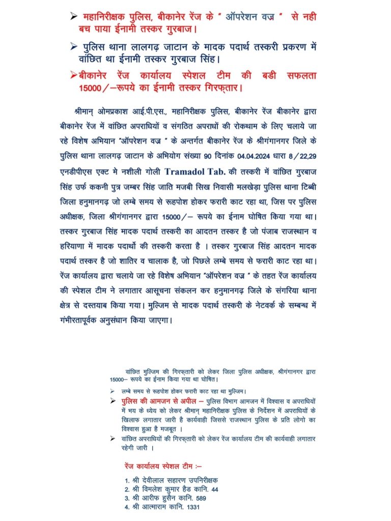 बीकानेर पुलिस प्रशासन द्वारा ऑपरेशन वज्र के तहत बीकानेर रेंज आईजी ऑफिस की स्पेशल टीम ने शुक्रवार को बड़ी कार्रवाई करके 15000 के इनामी तस्कर गुरवेज सिंह उर्फ ककनी को गिरफ्तार किया गिरफ्तार में आए तस्कर गुरदेव सिंह श्रीगंगानगर थाने में दर्ज नर्सरी गोलियों की तस्करी के मामले में पिछले साल भर से फरार चल रहा था गंगानगर एसपी ने आरोपी पर 15000 का इनाम घोषित कर रखा था वही आईजी रेंज ऑफिस की स्पेशल टीम ने तस्कर गुरबेज सिंह को अपनी मोस्ट वांटेड सूची में शामिल कर रखा था स्पेशल टीम को जानकारी मिली कि गुरबेज सिंह संगरिया थाना क्षेत्र में अपने एक ठिकाने पर छुपा हुआ है मौके पर टीम ने घेराबंदी करके उसे दस्तयाब कर लिया।