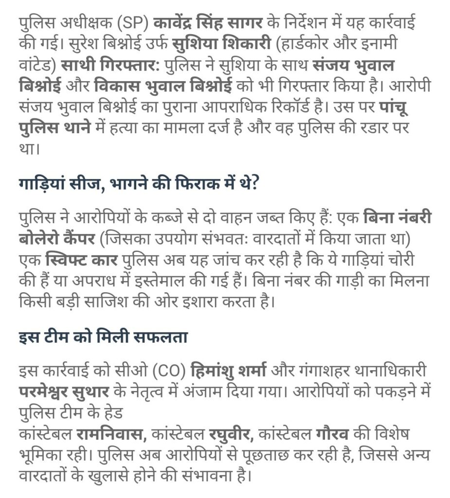 बीकानेर के गंगा शहर थाना पुलिस ने बड़ी कार्रवाई करते हुए हार्डकोर और इनामी अपराधी सुरेश बिश्नोई उर्फ सुशिया शिकारी को गिरफ्तार किया है, पुलिस ने सुरेश बिश्नोई सहित दो उसके साथियों को भी गिरफ्तार किया है जिसमें एक हत्या के मामले में फरार चल रहा था पुलिस ने दो लग्जरी गाड़ियां भी बरामद की है।