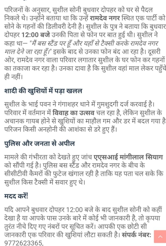 गंगा शहर थाना क्षेत्र के करनाणी मोहल्ले में रहने वाले 40 वर्षीय सुशील सोनी, बुधवार दोपहर से संदिग्ध परिस्थितियों में लापता हो गए हैं, सुशील सोनी सोनी के आभूषणों की डिलीवरी देने हेतु गए थे जो कि अपने निश्चित स्थान पर नहीं पहुंचे, और ना ही वापस घर लौटे इस घटना ने व्यापार जगत और क्षेत्र में सनसनी फैला दी है।