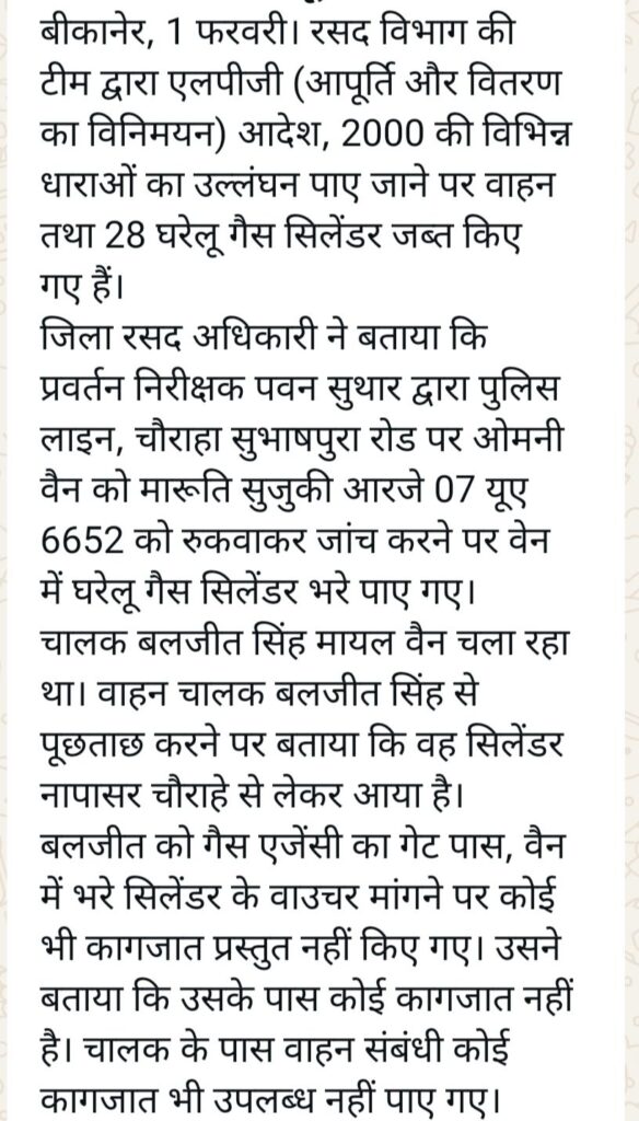 बीकानेर रसद विभाग ने बड़ी कार्रवाई करते हुए एक वाहन से 28 अवैध घरेलू सिलेंडर जप्त किये ।