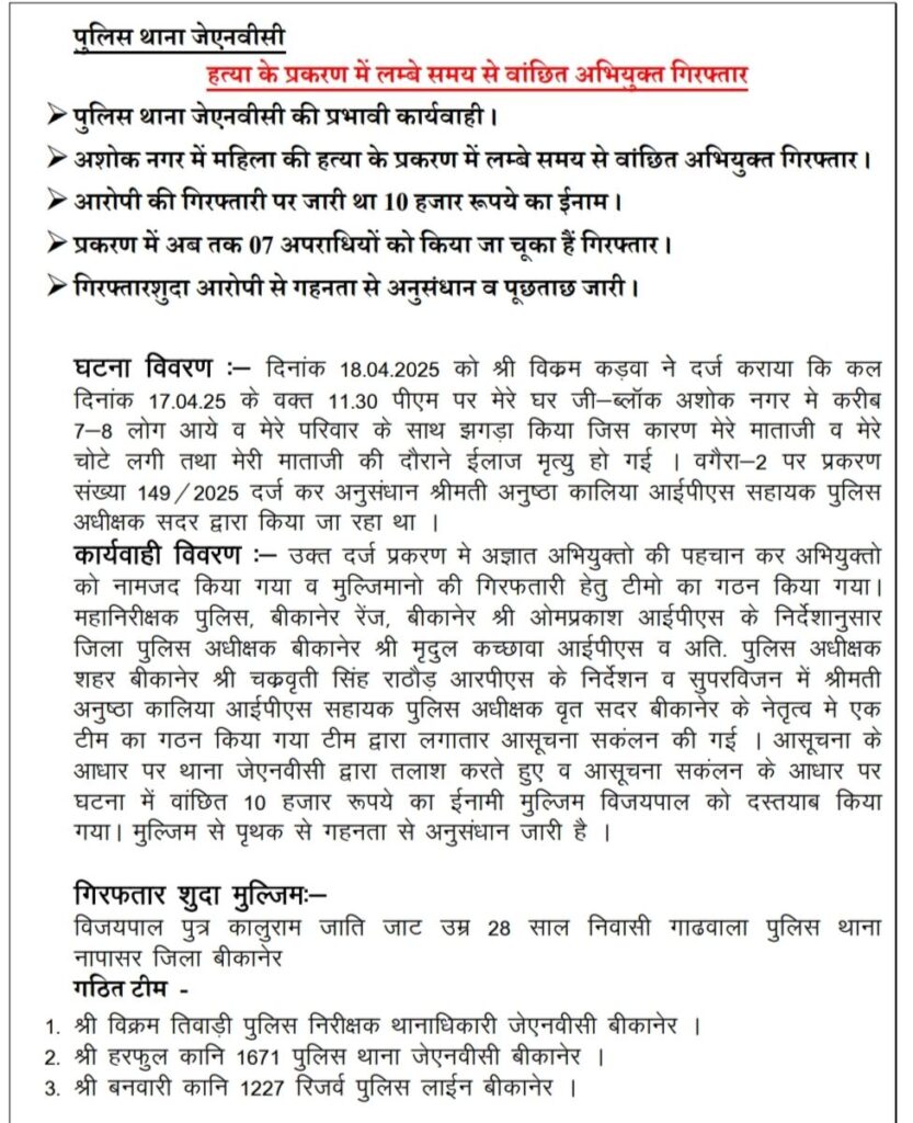 बीकानेर के जय नारायण व्यास कॉलोनी थाना पुलिस ने प्रभावी कार्रवाई करते हुए अशोकनगर में महिला की हत्या के मामले में लंबे समय से फरार चल रहे अभियुक्त को गिरफ्तार किया है गिरफ्तार किए गए आरोपों पर ₹10000 का इनाम था मामले में अब तक 7 अपराधियों को गिरफ्तार किया जा चुका है पकड़े गए आरोपी विजयपाल पुत्र कालूराम जाति जाट उम्र 28 साल निवासी गार्डवाला से पुलिस अनुसंधान कर रही है।