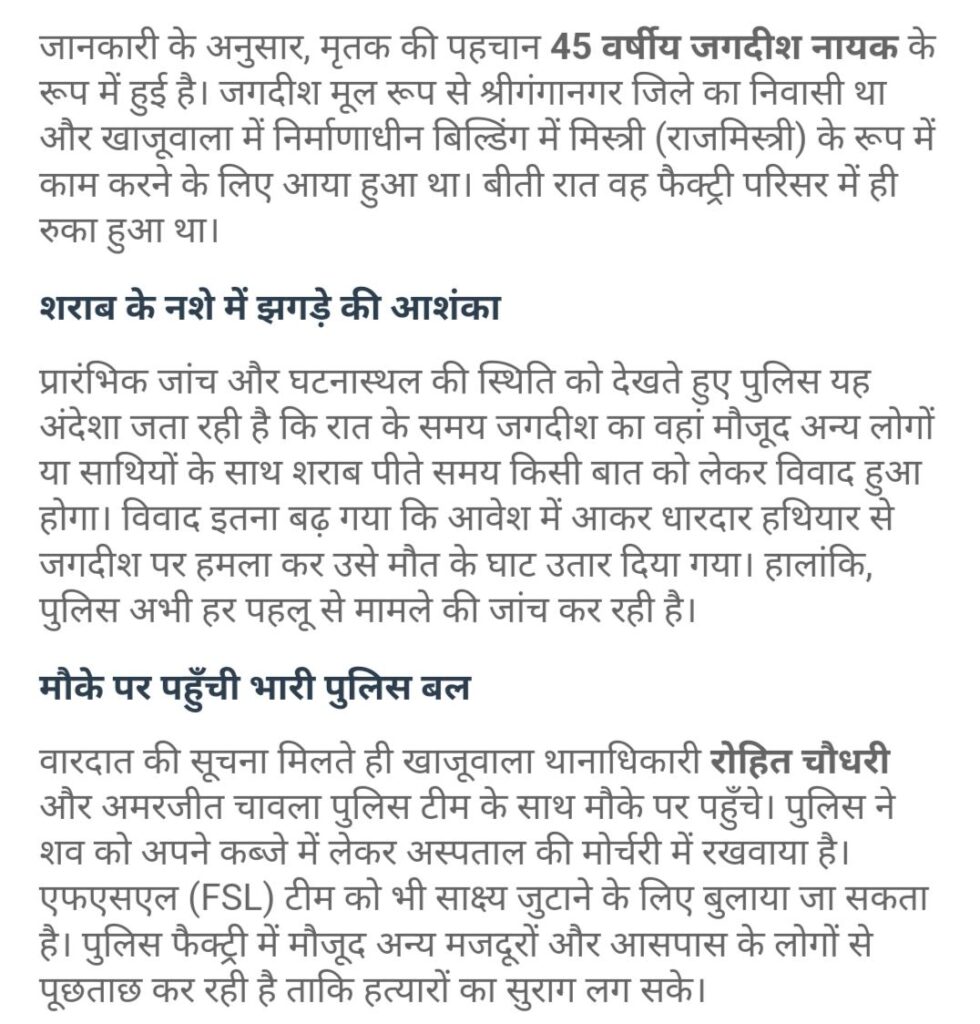 बीकानेर शहर के खाजूवाला इलाके में गत रात्रि को हत्या की सनसनीखेज वारदात सामने आई है, जहां के 18 केजेडी फाटे के नजदीक, एक कपास ब्लॉक फैक्ट्री में काम करने आए मिस्त्री की धारदार हत्या हथियार से हत्या कर दी गई। घटना की सूचना मिलते ही पुलिस प्रशासन के आल्हा अधिकारी तुरंत मौके पर पहुंच गए और मामले की जांच शुरू की और मौका मुआयना किया।