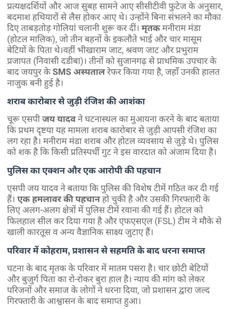 अंधाधुंध होटल में फायरिंग करके व्यापारी की हत्या की घटना चुरू जिले बिदासर कस्बे से है जहां नोखा रोड स्थित होटल रॉयल ट्रीट में सोमवार को देर रात्रि को अंधाधुंध फायरिंग की गई, घटना रात्रि के 12:15 की है जब बदमाशों ने होटल में घुसकर फायरिंग की, इस हमले में होटल मालिक मनीराम मंडा की मौके पर ही मृत्यु हो गई, जबकि तीन अन्य साथी घायल हो गए।
