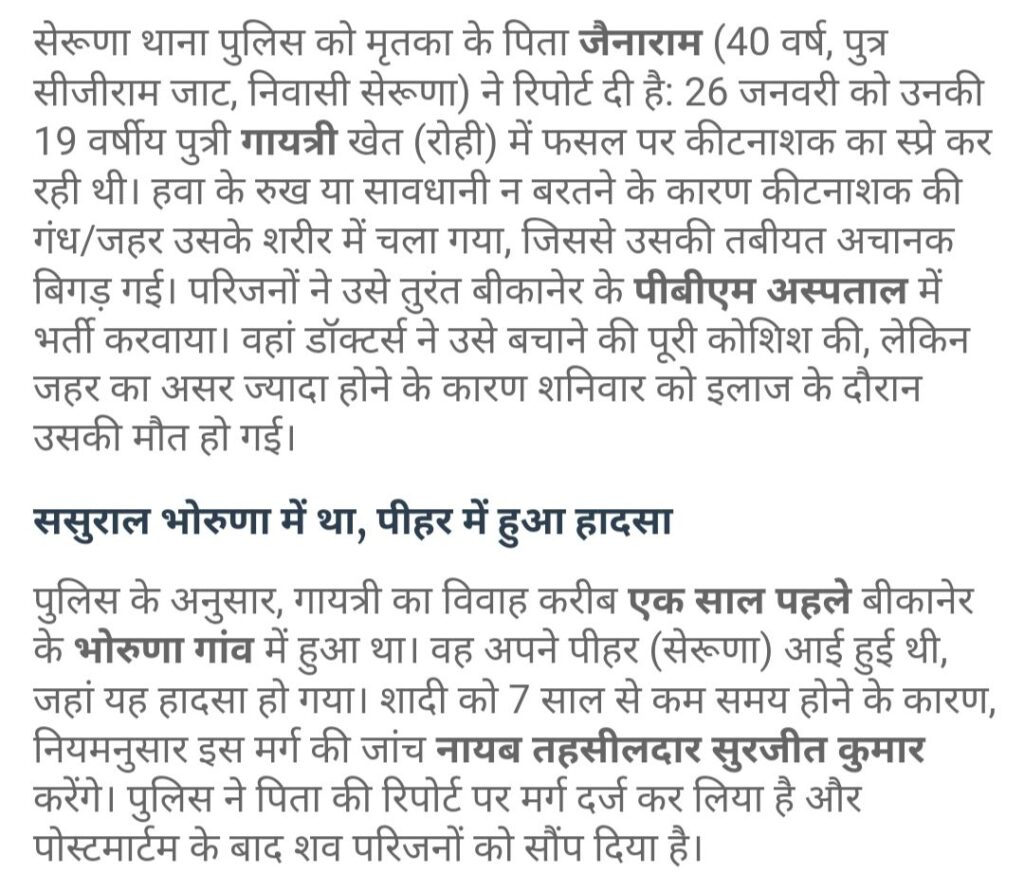 बीकानेर के डूंगरगढ़ कस्बे क्षेत्र में जहर की वजह से एक 19 वर्षीय महिला के जान जाने की खबर सामने आई है, घटना से सेरुणा गांव की रोही की है जहां कीटनाशक का छिड़काव करते समय इसका असर महिला पर हो गया और पिछले 5 दिनों से वह पीबीएम अस्पताल में जिंदगी और मौत से लड़ रही थी, और शनिवार को वह जिंदगी की जंग हार गई, हालांकि महिला की शादी को अभी साल भर भी नहीं हुआ है इसलिए इसकी जांच नायब तहसीलदार करेंगे,