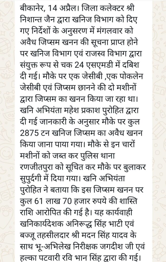 बीकानेर खनिज व राजस्व विभाग ने अवैध खनन के खिलाफ बड़ी कार्रवाई की