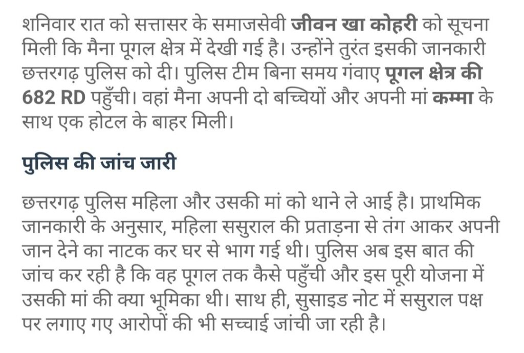 बीकानेर के छतरगढ़ थाना क्षेत्र में नहर किनारे सुसाइड नोट और कपड़े  और गहने छोड़कर एक महिला अपने बच्चीयो संग लापता हो गई, और आशंका  यह जताई जा रही थी कि महिला ने नहर में छलांग लगा ली बच्चीयो सहित लेकिन अब इस मामले में नया मोड़ आया है महिला को शनिवार की रात्रि पुगल क्षेत्र से सुरक्षित ढूंढ लिया गया है महिला अपनी मां और बच्चियों के साथ एक होटल के बाहर बैठी थी।