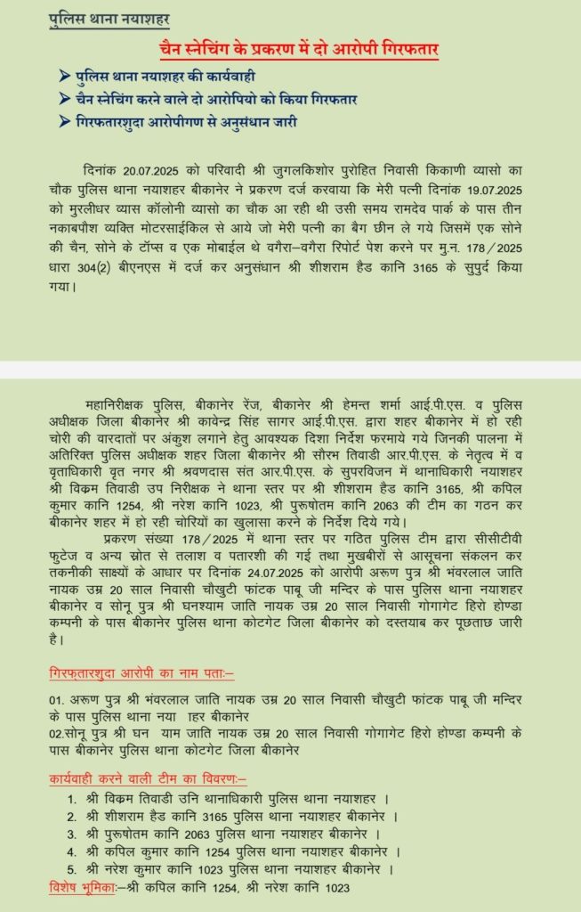 बीकानेर महिला के गहनों से भरा बैग लूटने वालों को पुलिस ने पकड़ा