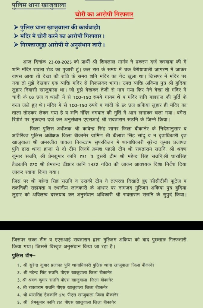 बीकानेर के खाजूवाला थाना पुलिस ने बड़ी कार्रवाई करते हुए मंदिर में चोरी करने के आरोपी को गिरफ्तार किया है गिरफ्तार किए गए आरोपों से अनुसंधान जारी है मामले को लेकर शिवलाल भार्गव ने मामला दर्ज करवाया कि मैं शनि मंदिर रावला रोड का पुजारी हूं रात्रि के समय चक बेरिया वाली में जागरण में जाकर वापस आया तो देखा रात्रि के समय शनि मंदिर का गेट खुला हुआ था जिस पर मैं मंदिर में गया तो मुझे देखकर एक व्यक्ति मंदिर से निकल कर भाग वह व्यक्ति अखियां पुत्र श्री बुदिया लोहार निवासी खाजूवाला था जो मुझे देखकर तेजी से भाग गया मैं फिर देखा तो मंदिर में चांदी के छह छत्र थाली में से सो डेढ़ सौ रुपए ले गए थे वह मंदिर शनि महाराज की मूर्ति के वस्त्र जले हुए थे मंदिर में से 100 डेढ़ सौ रुपए का चांदी के छत्र अखिया लोहार ही मंदिर का ताला तोड़ कर ले गया है शनि मंदिर में भगवान की मूर्ति में आग लगाकर चला गया वगैरा रिपोर्ट पर मुकदमा दर्ज करके अनुसंधान श्री रावताराम के सुपुर्द की गई थी