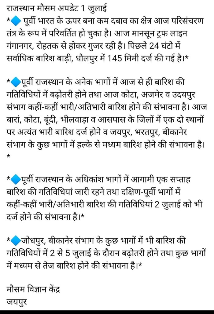 राजस्थान में पड़ रही गर्मी के बीच मानसून की बारिश लगातार हो रही है मौसम में लगातार राजस्थान में मौसम में बदलाव देखने को मिल रहा है पश्चिमी विक्षोभ के कारण कुछ इलाकों में पिछले 24 घंटे में हल्की बारिश हुई जिसकी वजह से तापमान में गिरावट देखने को मिली । राज्य में आज से बारिश की गतिविधियां बढ़ाने की संभावना है मौसम के विभाग के अनुसार बंगाल की खाड़ी में एक नया लो प्रेशर सिस्टम झारखंड की ओर आ गया है इसके पश्चिम दिशा की तरफ आने की संभावना है इसके प्रभाव से आज प्रदेश में बारिश की गतिविधियों में बढ़ोतरी हो गई जिसके बाद एक बार फिर प्रदेश में तापमान में गिरावट आएगी और लोगों को गर्मी से राहत मिलेगी पश्चिमी राजस्थान के बीकानेर बाड़मेर जोधपुर जैसलमेर के तीन-चार जिलो में तीन-चार जुलाई को बारिश होने की संभावना है सोमवार को कोटा उदयपुर भीलवाड़ा हनुमानगढ़ सीकर समिति खुद जिलों में हल्की बारिश देखने को मिली है आज से नया सिस्टम एक्टिव होने और उसके राजस्थान के लगभग सभी जिलों में बारिश हो सकती है।