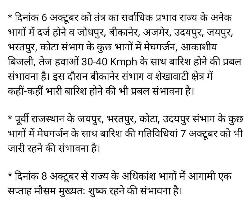 राज्य में सर्वाधिक बारिश बड़ी सादड़ी (चित्तौडगढ़) में 81.0 मिमी. दर्ज की गई,