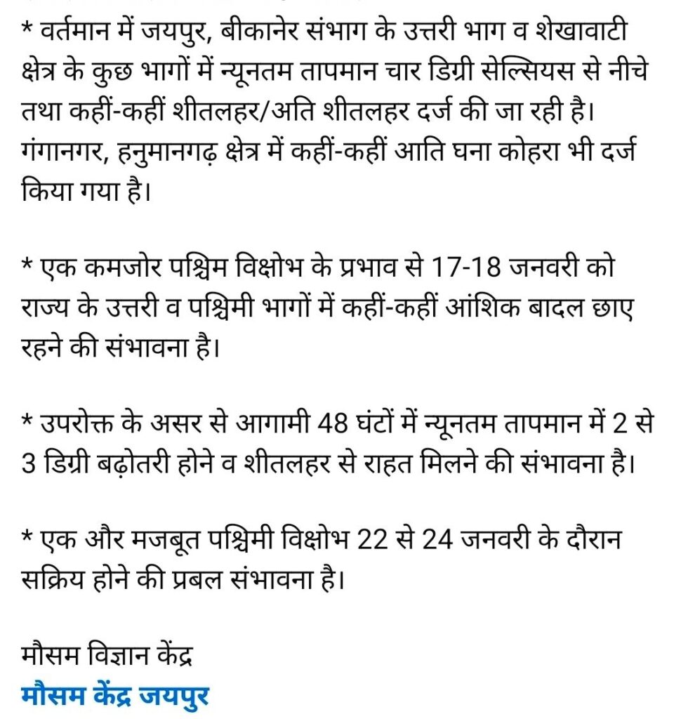 राजस्थान में एक बार फिर मौसम का मिजाज बदलने वाला है मौसम विज्ञान जयपुर केंद्र के अनुसारएक नया पश्चिमी विक्षोभ 19 जनवरी 2026 से उत्तर-पश्चिमी राजस्थान को प्रभावित कर सकता है इसके प्रभाव से राज्य के उत्तरी व पूर्वी जिलों में हल्के बादल छाये रहने की संभावना है