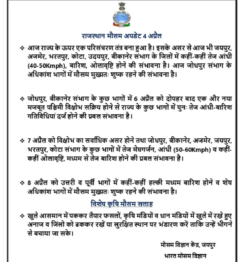 राज्य के कुछ भागों में 6-8अप्रैल को दोपहर बाद एक और नया मजबूत पश्चिमी विक्षोभ सक्रिय होने से राज्य के कुछ भागों में पुनः तेज आंधी-बारिश गतिविधियां दर्ज होने की प्रबल संभावना है।