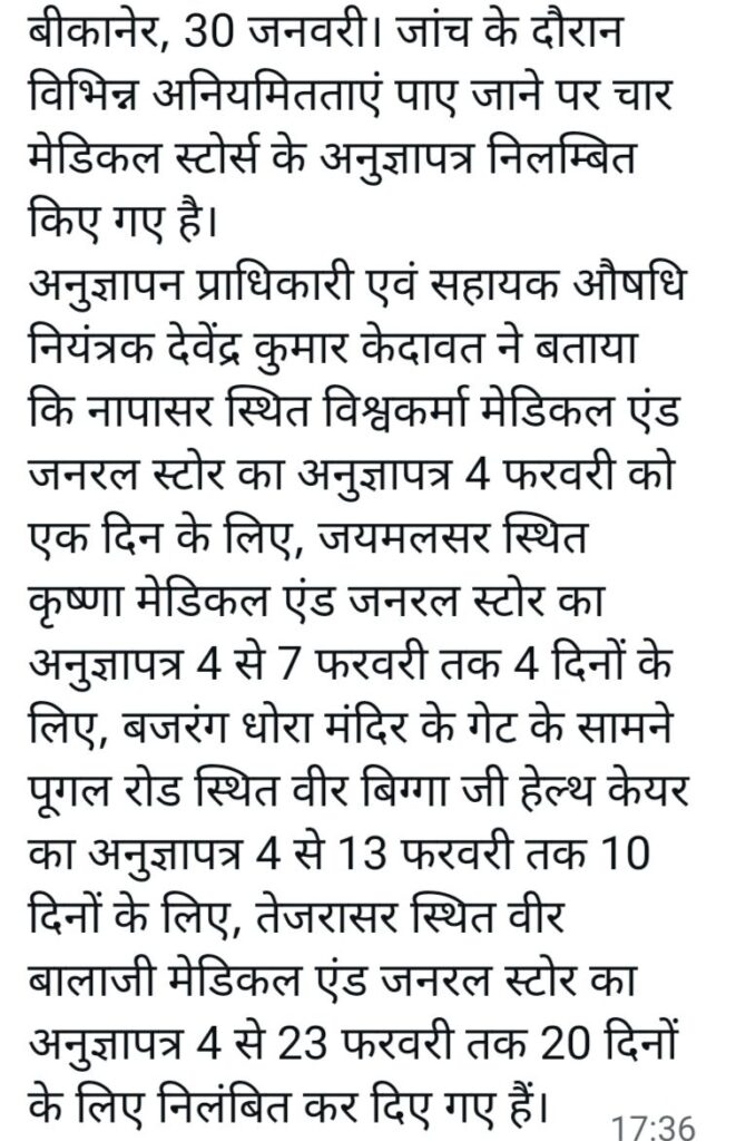 बीकानेर जांच के दौरान अनियमितताएं पाए जाने के कारण चार मेडिकल स्टोर के लाइसेंस निलंबित