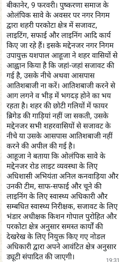 बीकानेर ओलंपिक सावा-नगर निगम उपायुक्त ने शहर वासियों से यह  आह्वान किया।
