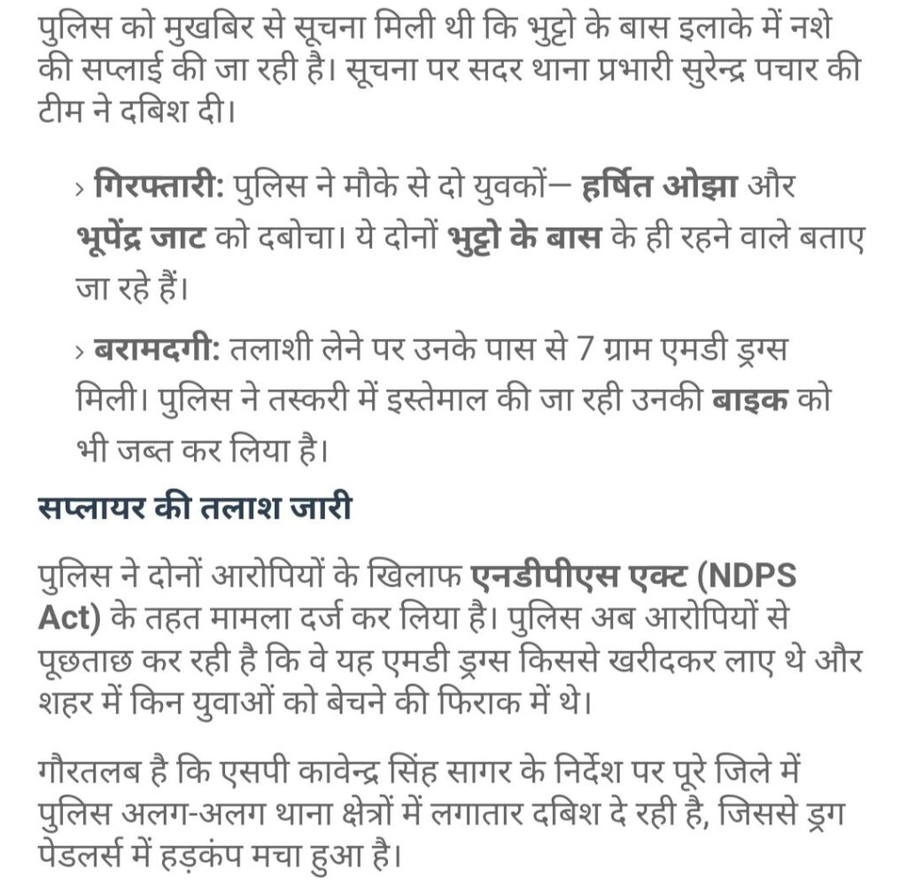 बीकानेर पुलिस द्वारा नशे के खिलाफ लगातार कार्रवाई जारी है इसी के चलते, सदर थाना पुलिस ने भूटो के बास इलाके में कार्रवाई करते हुए 7 ग्राम एमडी ड्रग सहित दो आरोपियों को गिरफ्तार किया है।