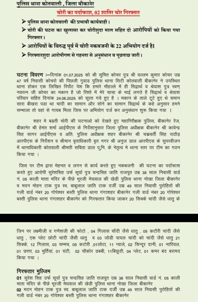 बीकानेर के कोतवाली थाना पुलिस में प्रभावी कार्यवाही करते हुए चोरी की घटना का खुलासा करके चोरी किया हुआ माल सहित दो आरोपियों को गिरफ्तार किया है आरोपियों के विरुद्ध पूर्व में चोरी और नकब्जानिक के 22 मामले दर्ज हैं गिरफ्तार किए गए आरोपों से पूछताछ की जा रही है और अनुसंधान जारी है।