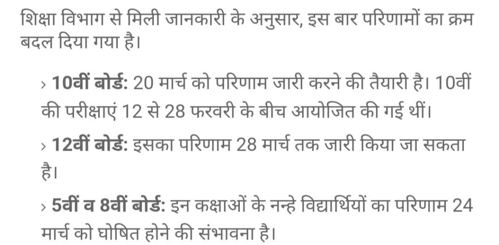 बड़ी खबर इस वक्त परीक्षार्थियों के रिजल्ट को लेकर है राजस्थान शिक्षा बोर्ड और माध्यमिक शिक्षा बोर्ड, मैं इस साल बड़ा कदम उठाते हुए, बोर्ड परीक्षाओं के परिणाम की समय सीमा पूरी तरीके से बदल दी है जो परिणाम पहले जून के महीने में आते थे वह इस साल मार्च के महीने में ही जारी हो सकते हैं,