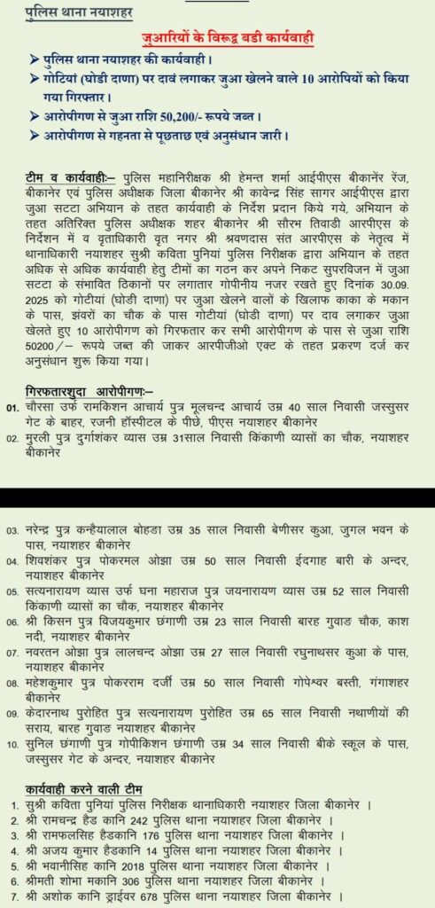 बीकानेर पुलिस की बड़ी कार्रवाई 10 जुआरियों को पकड़ा
