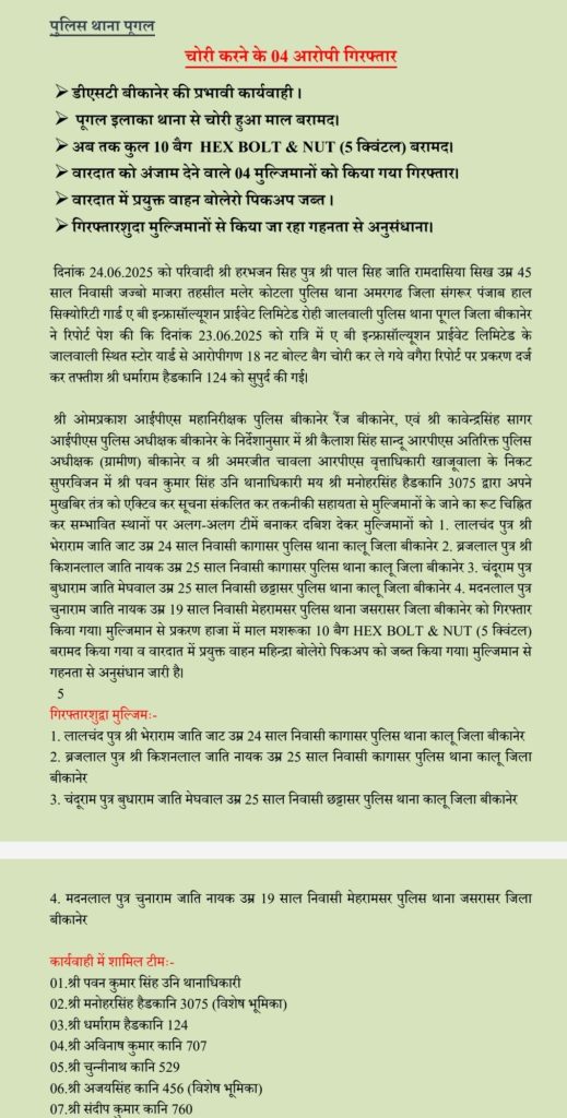 Bikaner News ATN/बीकानेर डीएसटी मैं बड़ी कार्रवाई करते हुए चोरी करने केशवराव को पकड़ा है, पुलिस ने पकड़े गए आरोपियों से पुगल क्षेत्र में हुई चोरी का माल बरामद किया है, अब तक कुल 10 बेगHEXBOLT and NUT 5 क्विंटल बरामद किया। वारदात को अंजाम देने वाले चार मुलजिमों को गिरफ्तार किया। वारदात में प्रयुक्त बोलोरो पिकअप गाड़ी भी पुलिस ने जप्त की है, गिरफ्तार किए गए मुलजिमों से पुलिस फिलहाल अनुसंधान कर रही है