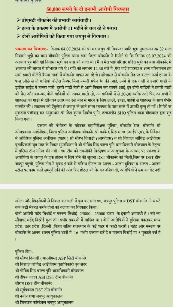 बीकानेर पुलिस ने शाहरुख हत्याकांड के मुख्य आरोपी 50000 के इनामी दो भाइयों को आखिरकार पकड़ा