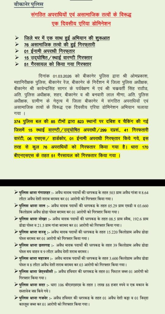 बीकानेर पुलिस ने संगठित अपराधियों एवं सामाजिक तत्वों के विरुद्ध एक दिवसीय एरिया डोमिनेशन की कार्रवाई पूरे जिले में एक साथ अभियान चला कर शुरुआत की है और 76 और असामाजिक तत्वों की गिरफ्तारी की है जिसमें एक इनामी अपराधी गिरफ्तार किया है और 15 उद्घोषित /स्थाई वारंटी गिरफ्तार किए गए 51 गेरसायल को गिरफ्तार किया है।