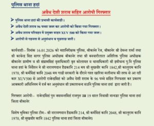 बीकानेर के हदा पुलिस थाने द्वारा प्रभावी कार्रवाई की गई देसी शराब के 96 पवे जप्त करके आरोपी को गिरफ्तार किया परिवहन में प्रयुक्त वाहन XUB 580 कार पुलिस ने जप्त किया। पुलिस पकड़े गए आरोपों से अनुसंधान व पूछताछ कर रही है