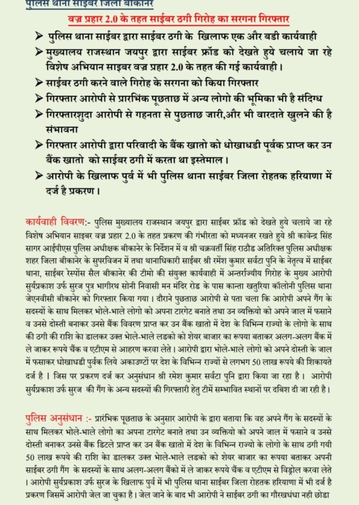 Bikaner/जिला पुलिस अधीक्षक कावेन्द्र सागर के निर्देशन में साइबर टीम ने थानाधिकारी रमेश सर्वटा की अगुवाई में बड़ी कार्रवाई करते हुए 50 लाख की साइबर ठगी के आरोपी को गिरफ्तार किया है