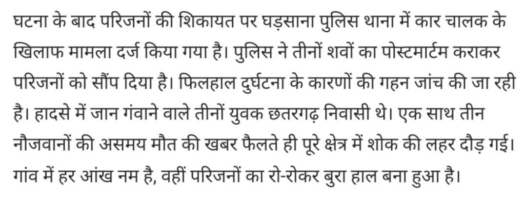 भीषण सड़क दुघर्टना की खबर, छतरगढ़ से घड़साना क्षेत्र से है, जहां पर खुशियां अचानक मातम में बदल गई, श्याम वर्ण गौशाला के नजदीक 5 एम एल डी, क्षेत्र में अचानक तेज रफ्तार गाड़ी से बाइक की जबरदस्त टक्कर हो गई, टक्कर इतनी जबरदस्त थी कि बाइक पर सवार तीनों युवा के उछलकर सड़क पर जा गिरे, दुर्घटना के बाद ऑन को स्थानीय लोगों ने अस्पताल पहुंचाया जहां पर चिकित्सकों ने 2 युवकों को मृत् घोषित कर दिया, और एक युवक की हालत गंभीर होने पर उसे बीकानेर के पीबीएम अस्पताल रेफर किया गया, मगर रास्ते में ही उसने भी दम तोड़ दिया,