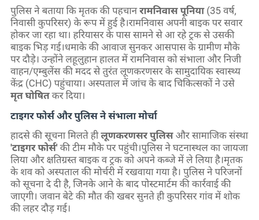 भीषण सड़क दुर्घटना की खबर बीकानेर के लूणकरणसर थाना क्षेत्र से, जहां पर सड़क दुर्घटना में एक युवक की दर्दनाक मृत्यु हो गई, दुर्घटना हरियासर गांव के नजदीक हुई, जहां पर तेज रखना ट्रक और बाइक की टक्कर हो गई, टक्कर इतनी तेज थी की बाइक सवारी युवक गिरकर गंभीर घायल हो गया, ग्रामीण तुरंत योग्य आवश्यकता लेकर पहुंचे लेकिन उसकी मृत्यु हो चुकी थी।