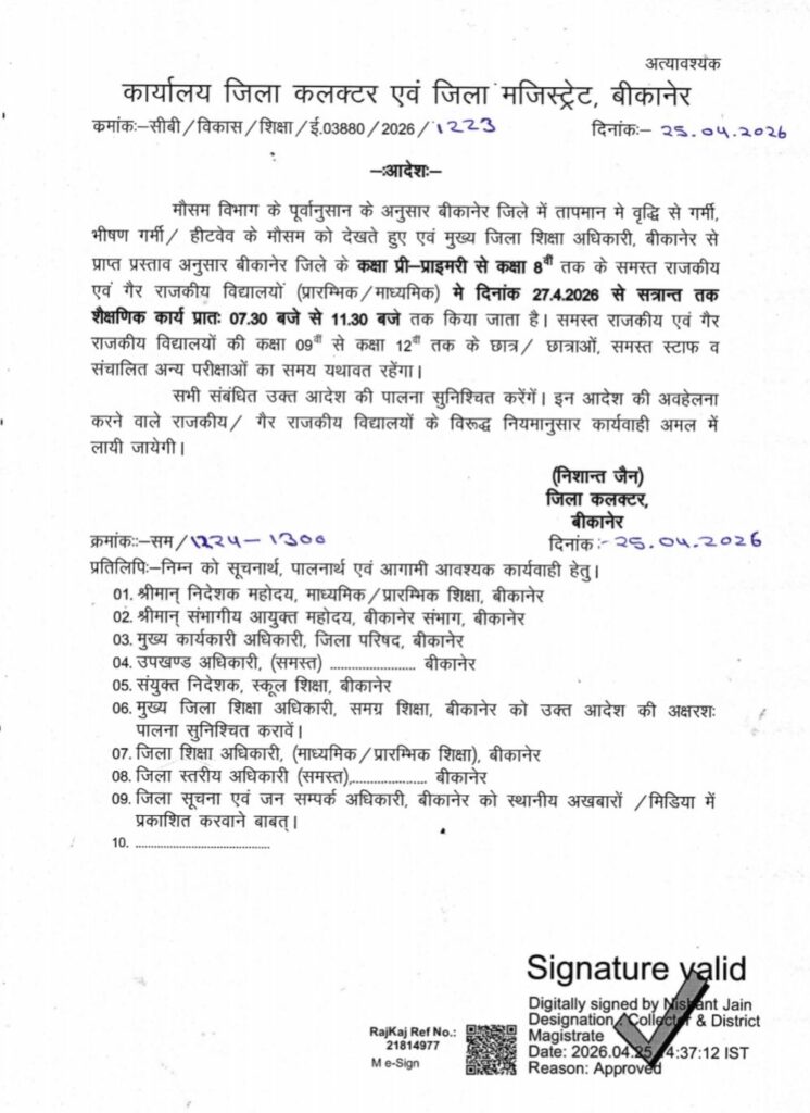 मौसम विभाग के पूर्वानुमान के अनुसार बीकानेर जिले में तापमान बढ़ोतरी से गर्मी भीषण गर्मी व हीट वेव के मौसम को देखते हुए मुख्य जिला शिक्षा अधिकारी बीकानेर से प्राप्त प्रस्ताव के अनुसार बीकानेर जिले के कक्षा प्री प्राइमरी से आठवीं तक के समस्त राजकीय एवं गैर राजकीय विद्यालयों में दिनांक 27.4.26 से शैक्षणिक कार्य प्रत्यक्ष 7:30 बजे से 11:30 बजे तक किया जा सकता है समस्त राजकीय एवं गैर राजकीय विद्यालयों की कक्षा 9 से कक्षा 12 तक के छात्र-छात्राओं समस्त स्टाफ व संचालित अन्य परीक्षाओं का समय यथावत रहेगा।