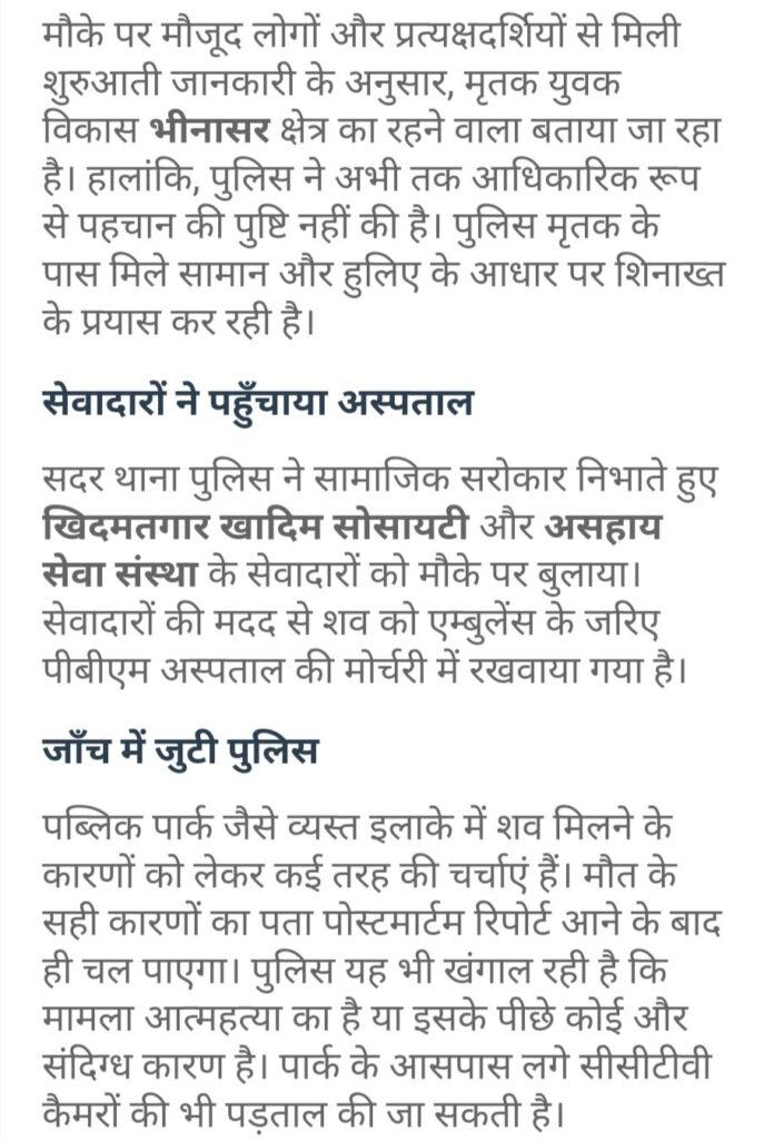 बीकानेर के सदर थाना क्षेत्र में पब्लिक पार्क में शव मिलने से क्षेत्र में सनसनी फैल गई, पार्क में भ्रमण करने आए लोगों ने पुलिस को इस बात की सूचना दी, घटना की सूचना मिलते ही सदर थाना पुलिस तुरंत टीम सहित मौके पर पहुंची और मामले की जांच शुरू की