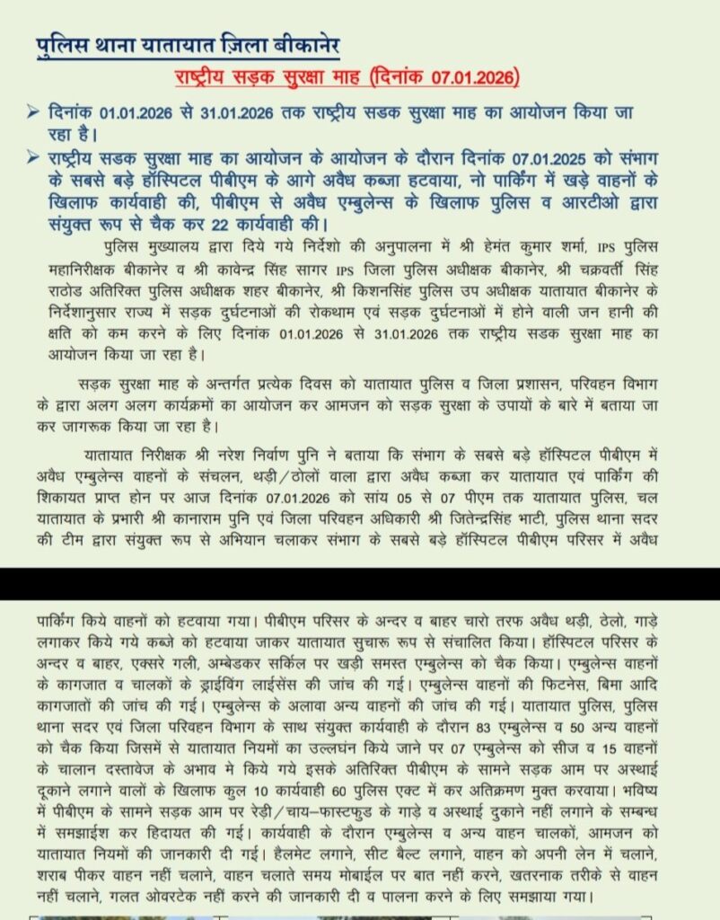 बीकानेर प यातायात पुलिस द्वारा राष्ट्रीय सड़क सुरक्षा सप्ताह सुरक्षा माह का आयोजन करते हुए संभाग के सबसे बड़े हॉस्पिटल पीबीएम के आगे अवैध कब्जा हटवाया नो पार्किंग में खड़े वाहनों के खिलाफ कार्रवाई की पीबीएम से अवैध एंबुलेंस के खिलाफ व पुलिस में आरटीओ द्वारा संयुक्त रूप से चेक करके 22 के खिलाफ कार्रवाई की।