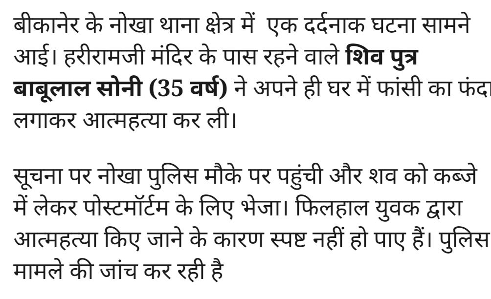 City/Local युवक ने की आत्महत्या Pradeep Kumar Modi September 26, 2025 0 युवक द्वारा आत्महत्या की घटना बीकानेर के नोखा थाना क्षेत्र से है Post navigation Previous: बीकानेर दो परिवारों में आपसी हिंसक विवाद हुआ इस क्षेत्र मेंNext: कैसा रहेगा अगले दिनों में मौसम विभाग का अपडेट। More Stories City/Local *उचित मूल्य की रिक्त व नवसृृजित दुकानों के साक्षात्कार 24 से 26 फरवरी को* Pradeep Kumar Modi February 11, 2026 0 City/Local बीकानेर सिलेंडर ब्लास्ट पांच लोग चपेट में आए अस्पताल में इलाज जारी। Pradeep Kumar Modi February 11, 2026 0 City/Local Crime पुलिस ने दो शातीर बदमाशों को पकड़ा नशीला पदार्थ व हथियार सहित Pradeep Kumar Modi February 10, 2026 0 Leave a Reply Cancel replyYour email address will not be published. Required fields are marked *Comment * Name * Email * Website Save my name, email, and website in this browser for the next time I comment.